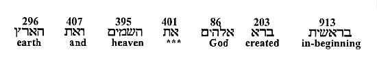 Not only words, but also complete thoughts and sentences have number values. To illustrate, let's take the very first verse of the Bible: "In the beginning God created the heaven and the earth." (Note: Hebrew is read from right to left---just the opposite of English.)