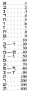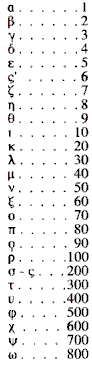The Greek number code as it is shown above, can be found in most editions of Webster's Dictionary. It has been in use since early times. The Hebrew number code was in use many centuries before Christ. If you were to look into a present-day Hebrew Bible, you would find the chapter and verse numbers given with the letters of the Hebrew alphabet.